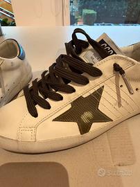 "macchie" color panna e grigie. Talloncino color bronzo, iconica stella sui lati in pelle stampa di cocco color oliva, lacci marroni. Completa di scatola, sacchetto, dustbag, talloncino nfc. Indossate una volta, vendo perché non si addicono al mio stile quotidiano.