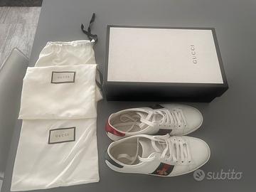 Vendo sneakers Gucci Ace originali in pelle bianca, con iconico nastro Web verde/rosso e ape dorata ricamata. Dettaglio sul tallone in pelle rossa/verde effetto pitonato.