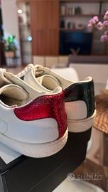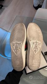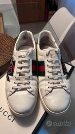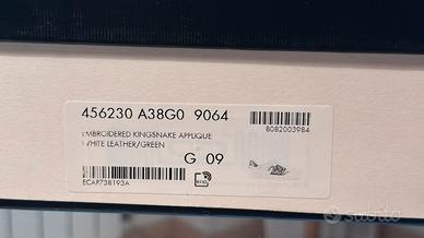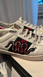 Vendo iconiche sneakers Gucci Ace con ricamo serpente. Le scarpe sono originali (acquistate nel 2021), usate con cura e ancora in buono stato generale, perfettamente indossabili così come sono. La taglia indicata è Gucci 9 (corrisponde a un 43/44 italiano, data la calzata abbondante del modello). Io per esempio porto 44/45. Fornite con scatola originale, lacci di ricambio nuovi (mai usati), e booklet di ringraziamento Gucci. La pelle e il ricamo sono integri. Con una pulizia professionale o un leggero intervento di calzoleria, le scarpe possono tornare pari al nuovo. Presentano i normali segni di utilizzo sulla pelle e sulla gomma (leggermente ingiallita, come tipico del modello). Il logo sul tallone è parzialmente sbiadito, dettaglio che non pregiudica l'estetica generale una volta indossate. Disponibile per spedizione con TuttoSubito o ritiro a mano zona Brescia (preferirei).
