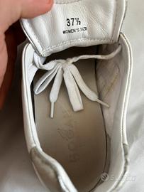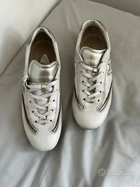 Bellissime scarpe Hogan da donna, numero 37,5. Sono in pelle bianca e argento, con dettagli in mesh. Le scarpe presentano un aspetto leggermente vissuto, ma sono ancora in ottime condizioni. Molto comode e adatte ad ogni occasione.
