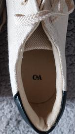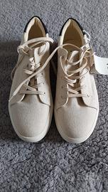 Vendo un paio di sneakers basse da uomo, nuove e mai indossate, con cartellino originale ancora attaccato. Dettagli principali: Marca: C&A Colore: Ecru / Bianco sporco (un colore neutro e molto versatile) Materiale: Tela robusta (ideali per la primavera/estate) Taglia: 41 (come visibile sulla suola e sul cartellino) Design: Modello classico stringato, pulito, con suola in gomma bianca e un dettaglio a contrasto nero in similpelle sul tallone. Suola: In gomma bianca con un battistrada a zig-zag antiscivolo. Condizioni: Nuove con cartellino. Le scarpe non sono mai state usate; il cartellino originale è presente, anche se l'etichetta del prezzo rossa è stata strappata (come visibile in foto, probabile rimozione del prezzo per un regalo). Il resto dell'etichetta con i codici e la taglia è intatto. Non sono presenti difetti o macchie. Perfette per un look casual estivo, comode e leggere.