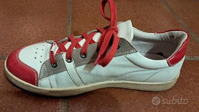 Scarpe John Galliano in pelle bianca con lacci rossi. Dettagli in pelle rossa e pelle scamosciata grigia.