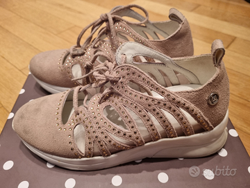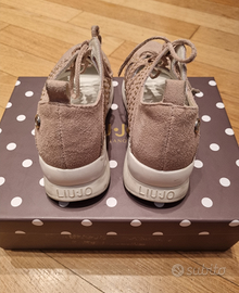 Sneakers Liu Jo modello Karlie con zeppa (circa 6 cm) e soletta interna rimovibile, in suede con inserti in tessuto trasparente e micro borchie strass. Chiusura con lacci. I lacci si possono legare anche intorno alla caviglia. I lacci presenti sono da cambiare in quanto usurati. Numero 35. Buone condizioni. Scatola originale. Consegna a mano. Eventuali spese di spedizione a carico dell'acquirente.