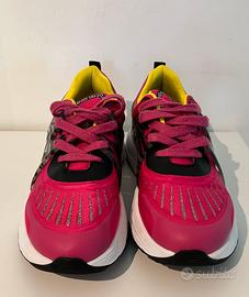 Scarpe Donna LIU JO Sneakers Running in Lycra colore Bianco e Fuxia (Mod. BA2141EX018). Sneakers running con tomaia ecosostenibile in lycra realizzata con poliestere riciclato. Maxi logo embossed sul fondo. Comoda suola Vibram.