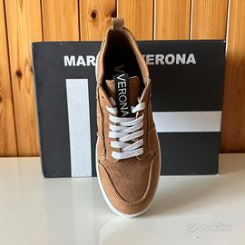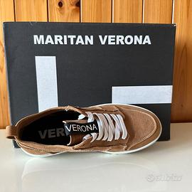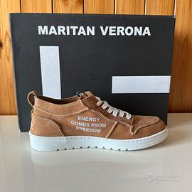 2. Sneakers Maritan Verona * Modello: Made in Italy, stile casual/urban. * Colore: Cuoio/Tabacco con suola bianca a contrasto. * Taglia: [ 40 ] * Condizioni: 10/10 – Nuove, mai uscite di casa. * Caratterizzate dalla scritta laterale "ENERGY COMES FROM FREEDOM". Pelle scamosciata di ottima qualità, artigianato italiano.