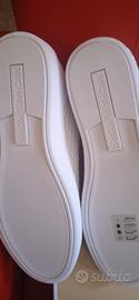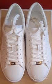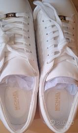 Bellissima sneakers Michael Kors, molto versatile poiché si adatta sia al casual che all'elegante, colore bianco ottico con dettagli in metallo dorato, mai indossate, praticamente "immacolate" come si può vedere dalle foto. Numero 7.5 ossia 37.5/38 italiano. Prezzo non trattabile.