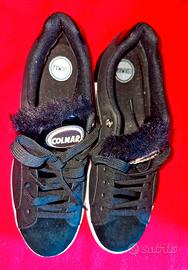 Sneakers nere in camoscio Colmar taglia 40 nuove con etichetta originale, rifinite con pelliccia ecologica, estremamente comode, soletta interna 25 cm, larghezza 9 cm, plateau 3 cm. Se avete altre domande, sarò felice di rispondervi.