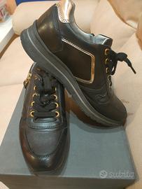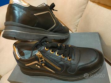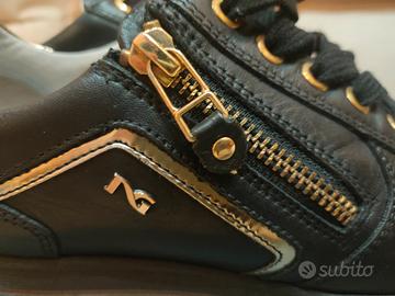 bellissime sneakers da donna firmate NeroGiardini, originali e realizzate in pregiata pelle nera. La scarpa unisce uno stile sportivo a dettagli eleganti, come le rifiniture in oro metallizzato sul tallone e sui profili, e la pratica zip laterale dorata che facilita la calzata.