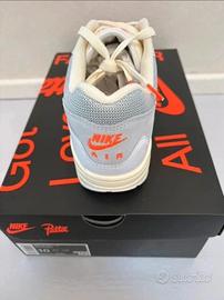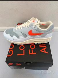 Vendo sneakers Nike Air Max 1 edizione 2026 per Patta con braccialetto incluso. Colori: bianco-grigio e arancione. Misura 44 - US 10. Nuove e mai indossate.