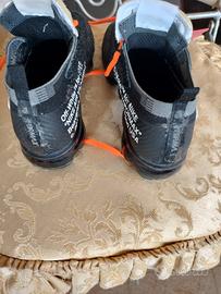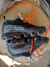 Stupenda Sneakers Unisex da Collezione Nike air x Off White NU 40 colore nero in tessuto speciale nylon PVC suola in gomma interno foderato poliestere suoletta in fibre chiusura laccio firmato con linguetta del Brend . Usato ma in ottima condizione qualche piccola usura lato retro tallone le rifiniture in PVC è un po' screpolato come noti dalle ultime foto . Le misure sono lunghezza sneakers cm 27 lunghezza suoletta interna cm 25 Calzano leggere ai piedi .