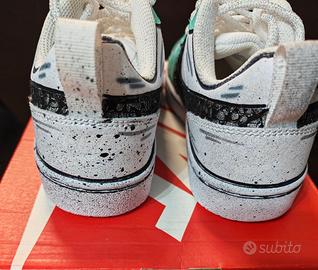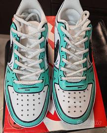 Scarpe originali Sneakers Collezione limitata Nike Court Borough Low 2 Swoosh Donna Custom by Seddys modello Libra NUOVO Scarpe Nike Court Borough Low 2 personalizzate. - Design unico con contorni neri e dettagli color acquamarina. - Lacci bianchi. Taglia: 37.5 Colore : Verde-azzurro e Bianco