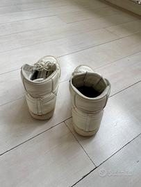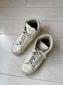 Sneakers Nike Blazer Mid Studio White in pelle. Misura EU 40 (US 7) Scatola originale NON inclusa. Scarpe MOLTO usate con numerose macchie e segni di usura. Stringhe danneggiate e rammendate. Suole in parte consumate. Non presentano odori e sono state igienizzate.