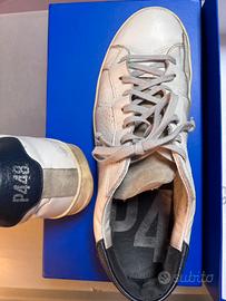 sneakers in pelle , scarpa bianca con tassello blu scuro .