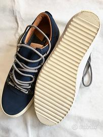Blu scamosciate, con interno in pelle fiore e suola in gomma bianca, numero 42 (USA 9)