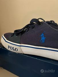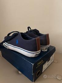 Scarpe basse da uomo in tela blu navy, con dettagli in ecopelle marrone sul tallone e logo Polo ricamato sul lato. Stile casual, perfette per la primavera/estate.