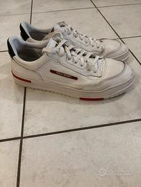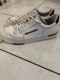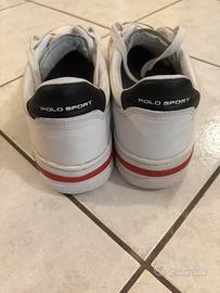 Vendo sneakers uomo della linea Polo Sport di Ralph Lauren, taglia 45. DESIGN: Modello in pelle bianca con eleganti dettagli a contrasto neri e rossi sulla suola. Stile casual-sportivo di alta classe. MATERIALI: Tomaia in pelle di qualità, molto resistente. STATO: Usate. Presentano segni di utilizzo sulla tomaia e sui bordi, ma l'estetica generale rimane ottima per un look quotidiano ricercato. Scarpa robusta e di marca che tiene molto bene il tempo. Disponibile per spedizione o consegna a mano.