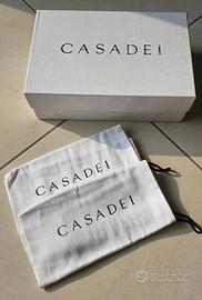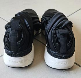 Vendo sneakers da donna originali marchio Casadei in raso nero misura 37. Calzate 4 volte per eventi di rappresentanza. Sono praticamente nuove. C'è solo qualche leggero segno sulla suola bianca in gomma in corrispondenza del tallone (foto 6). Scatola originale con 2 sacchettini logati per riporle individualmente. Scatola leggermente schiacciata in un angolo.