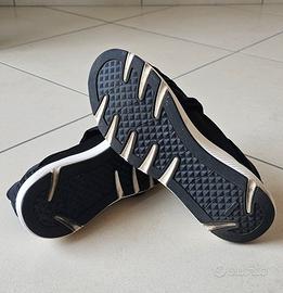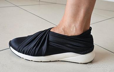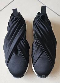 Vendo sneakers da donna originali marchio Casadei in raso nero misura 37. Calzate 4 volte per eventi di rappresentanza. Sono praticamente nuove. C'è solo qualche leggero segno sulla suola bianca in gomma in corrispondenza del tallone (foto 6). Scatola originale con 2 sacchettini logati per riporle individualmente. Scatola leggermente schiacciata in un angolo. Il modello è uno sportivo/elegante molto originale e modaiolo costituito da due fasce elasticizzate ed incrociate in satin. Non scalza. Soletta estraibile. Fondo e suola in gomma. Prodotto in Italia. Prezzo originario €495