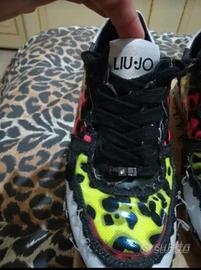 Sneakers Liu Jo numero 37 leopardate fluo con inserti di jeans nero sfrangiati