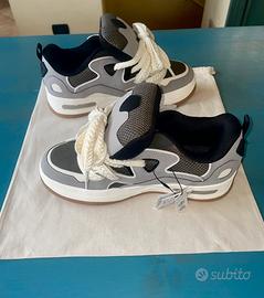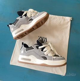 Sneakers Zara nuove con etichetta, grigio/nero/bianco, design moderno e suola in gomma. Perfette per un look casual!