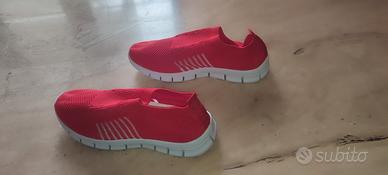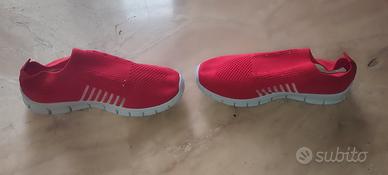 Sneakers slip-on rosso di tessuto elastico , perfette per un look casual e comodo. Le scarpe hanno anche i lacci in dotazione per chi preferisce indossare i lacci. Taglia 43 ma veste come un 42 - Design moderno con dettagli a righe. - Tomaia in tessuto traspirante elasticizzato - Suola bianca flessibile. - Sono dotate di morbide solette interne in memory - Sono idonee per lunghezza piede da 26 cm a 27 cm