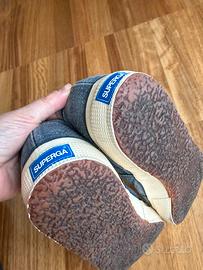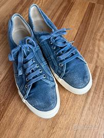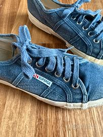 Scarpe Superga originali in tela colore blu, modello classico con suola in gomma bianca. Leggere, comode e versatili, perfette per la stagione primavera/estate e per l’uso quotidiano.