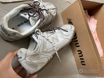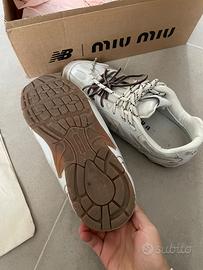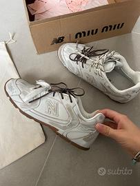 Sneakers bianche tipo New Balance per Miu Miu, praticamente nuove con un leggero difetto sulla suola come mostrato in foto. Comprese anche la dust bag e la scatola.