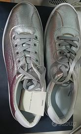 Vendo sneakers Tommy Hilfiger argento, taglia 40, praticamente nuove, con scatola e cartellino originale, indossate solo per prova come si può notare dalle suole praticamente immacolate.