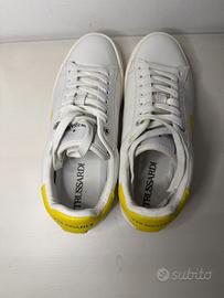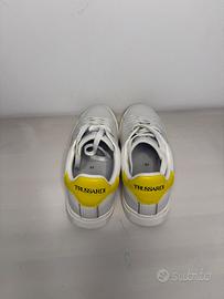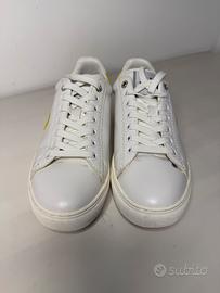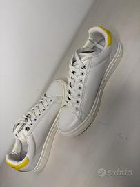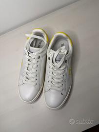Sneakers bianche Trussardi con tallone giallo e ricamo. Realizzate in pelle. Indossate pochissimo, condizioni pari al nuovo (suola e soletta quasi perfette, vedi foto). Taglia 37. Morbide e flessibili durante la camminata Vendo per inutilizzo (trope scarpe). Nel profilo disponibili anche altri articoli, tutti in condizioni come nuove.