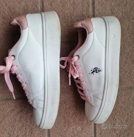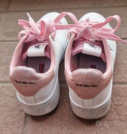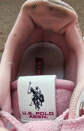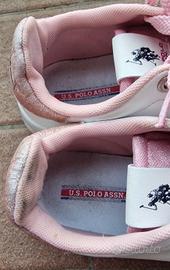 Vendo bellissime sneakers U.S. Polo Assn. originali, numero 38. Il design è bianco con lacci rosa a contrasto e dettaglio posteriore glitterato in oro rosa. Condizioni: Usate, ma in buone condizioni generali (come da foto). Dettagli: Logo ricamato lateralmente e sulla linguetta. Stile: Comode e perfette per il tempo libero.