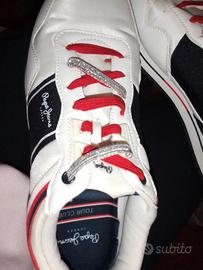 sneakers unisex PATRIZIA PEPE numero 43 in pelle bianca con decori blu e rossi. Lacci personalizzati in elastico blu e rossi