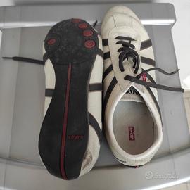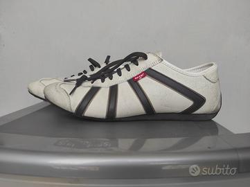 Sneakers originali Levi's, in pelle bianca, strisce nere e lacci marrone scuro.