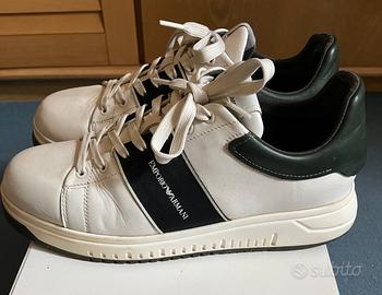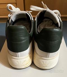 Sneakers uomo colore bianco con tallone in pelle verde scuro, banda laterale griffata nera. Il tessuto interno della scarpa sinistra , in corrispondenza del tallone, è un po’ usurato. Misura 43.