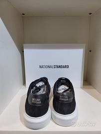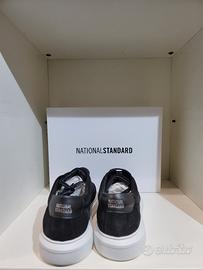 Sneaker uomo con tomaia in suede di colore nero. Puntale anteriore con lunetta in pelle in tinta di colore,lacci doppi in cotone cerato. Lunetta posteriore in pelle con logo National Standard di colore argento. Soletta interna ergonomica in soffice lattice alta 2,5cm per una calzata leggera e confortevole. Battistrada in gomma super light con fondo antiscivolo, taglia 42