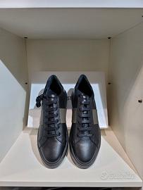 Sneaker uomo con tomaia in pelle di colore nero. Due barre laterali di colore verde militare e lunetta verde con logo National Standard di colore argento,sul contrafforte posteriore. Lacci doppi in cotone cerato,soletta interna in soffice lattice alta 2,5cm per una calzata leggera e confortevole. Battistrada in gomma super light con fondo antiscivolo,scarpa davvero molto bella,morbida,leggera e versatile. Taglia 44