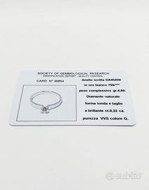 Anello in oro 18 KT( 750 ‰ ) di grammi 4.60 impreziosito da un diamante naturale taglio a brillante di ct. 0.22 purezza VVS colore G. Scritta Damiani.