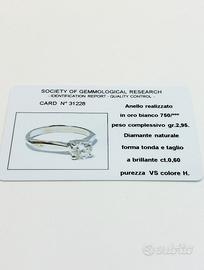 Anello in oro 18 KT( 750 ‰ ) di grammi 2.95 impreziosito da un diamante naturale taglio a brillante di ct. 0.60 purezza VS colore H.