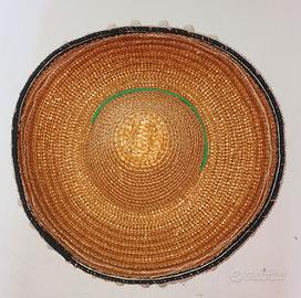 Cappello in paglia intrecciata, caratterizzato da una cupola conica e ampio bordo rifinito con nastrini decorativi e pon-pon/beads in tinta chiara.
