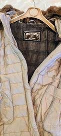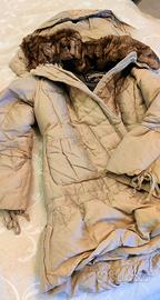 Piumino invernale Sonia Fortuna, color oro, con pelliccia sul collo e cappuccio. In ottime condizioni Tg 48