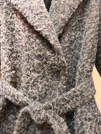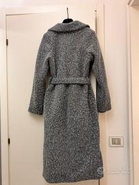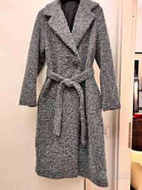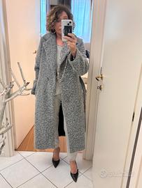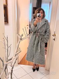 Soprabito grigio in tessuto Bouclé’, morbidissimo e leggerissimo. Modello attuale, lungo con cintura e tasche. Fodera in satin nero Misure: spalle 49, ascelle 49, lungo 119. Condizioni perfette