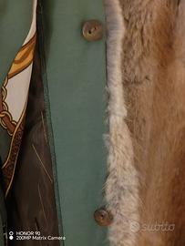 Soprabito donna elegante con interno di pelliccia staccabile e fodera Situssa. Colore verde chiaro, taglio sartoriale, unico bottone sotto al collo , cade perfettamente sul davanti, ha due tasche, dietro ha una profonda pince con bottone. Interno in pelliccia completamente staccabile, rendendo visibile la bellissima fodera in seta . Può essere indossato sia nella mezza stagione che in inverno. Veste comodamente una taglia 50-52 . La pelliccia fulva ( lapin? ) è assicurata al capo con tanti piccoli bottoni . La fodera è un crespo di Situssa con disegno a catene e nappine. Non è stato mai indossato. La marca è Santagostino.
