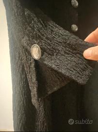 Soprabito elegante mezza stagione, lunghezza midi, tessuto goffrato con base nera e sfumature marroni.