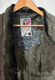 Bellissimo cappotto firmato Desigual, modello "Atypical Winter", caratterizzato da un mix di texture unico. Il corpo è in morbido tessuto scamosciato (faux suede) color marrone cioccolato, arricchito da maniche in maglia lavorata e un caldissimo interno in ecopelliccia sintetica verde muschio.
