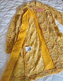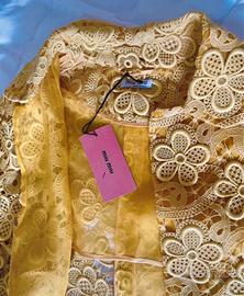 Elegante soprabito MIU MIU (originale) in pizzo giallo cedro con un delicato motivo floreale. Un capo unico per aggiungere un tocco di raffinatezza. È nuovo ancora con cartellino. Fodera in seta. Lavorazione straordinaria. Davvero molto bello ed elegante. Taglia 42 italiana (ma indossabile anche da una 44). Visto dal vivo è ancora più bello. Le foto non rendono…. - Motivo floreale all-over. - Design aperto. - Maniche lunghe.