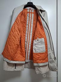 Trench, spolverino, impermeabile da uomo taglia 54. Esterno bianco ghiaccio ed inserto interno leggermente imbottito e munito di cappuccio arancione; quest’ultima parte è estraibile e utilizzabile all’occorrenza.