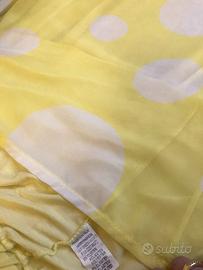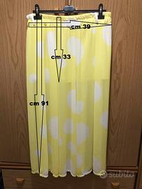 Sottana lunga gialla a pois bianchi di grandezza variabile (grandi medi più piccoli). Le misure sono in foto: in cintura misura cm 39 ma con elastico a riposo non tirato ed è lunga cm 91. Ha una sottogonna corta di cm 33 visto la trasparenza della stoffa. Ha tre passanti per la cintura 2 davanti e uno al centro dietro. La taglia è una 46 italiana ma con elastico molto morbido veste tranquillamente una 48 italiana