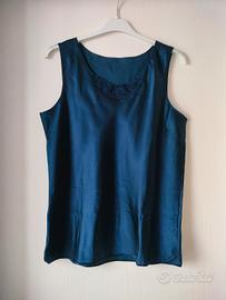 Sottogiacca blu navy a canotta, con collo ampio decorato in macramè. Materiale simile raso lucido.