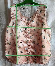 Sottogiacca in rasatello di color rosa baby sullo sfondo, arricchito da disegni floreali. Il tessuto è molto morbido. Si presta sia abbinato ad un abbigliamento elegante, sia sportivo, sia casual. Si chiude davanti mediante una serie di bottoni rivestiti con lo stesso tessuto.