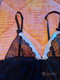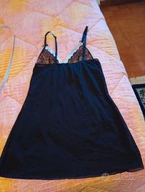 Sottoveste corta nera in nylon con coppa seno in pizzo bordata di raso pervinca dim. sottoseno cm 34 lungh. 65. Bretelline regolabili con fiocchetto in cima.