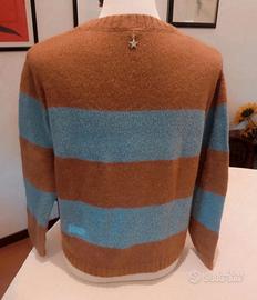 Maglione Donna a righe cammello e celeste con scritta frontale "LOVELY" e iconico dettaglio stella sul retro. Taglia Small, filato morbido con lana e mohair. Made in Italy, condizioni eccellenti.